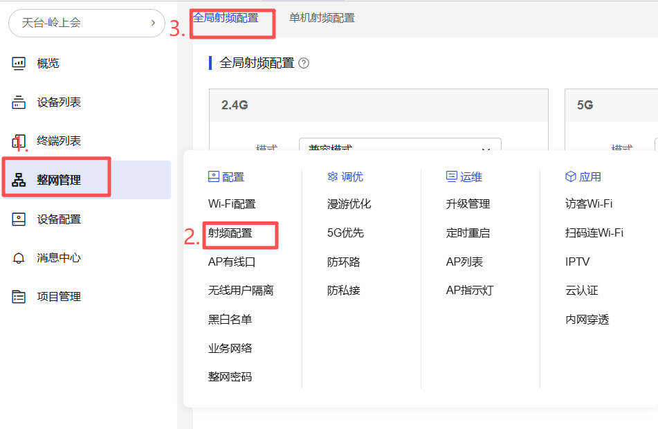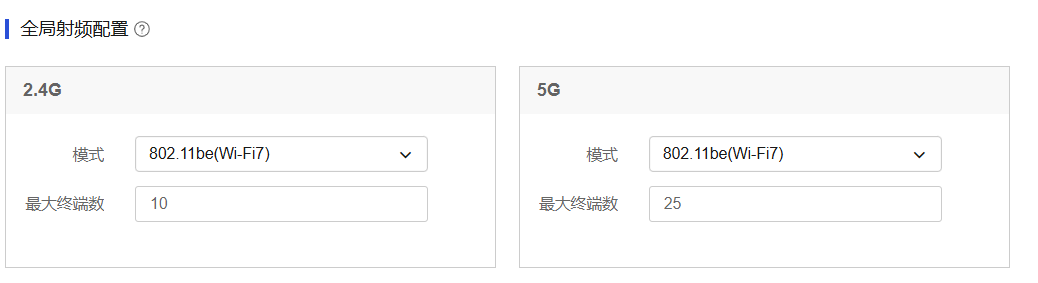 从简优云的“整网管理”——“射频配置”——“全局射频配置”处,我们可以看到,现场配置了最大接入终端数量,其中2.4G配置了10个,5G配置了25个。