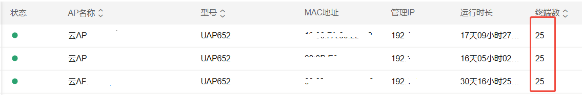 而现场AP的实际终端接入情况如下图,所有AP的接入终端数量均已达到设置值25。至此问题定位,已找到原因,现场配置的最大终端数不合理。