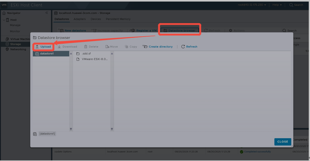 3.上传VMware-ESXi-8.0U3f-24784735-depot.zip离线包到ESXi上的datastore中。