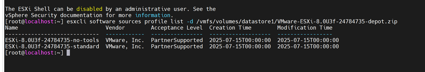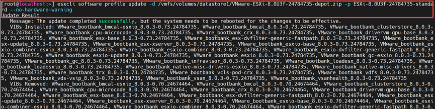 #esxcli software profile update -d /vmfs/volumes/datastore1/VMware-ESXi-8.0U3f-2478473-depot.zip -p ESXi-8.0U3f-24784735-standard --no-hardware-warning