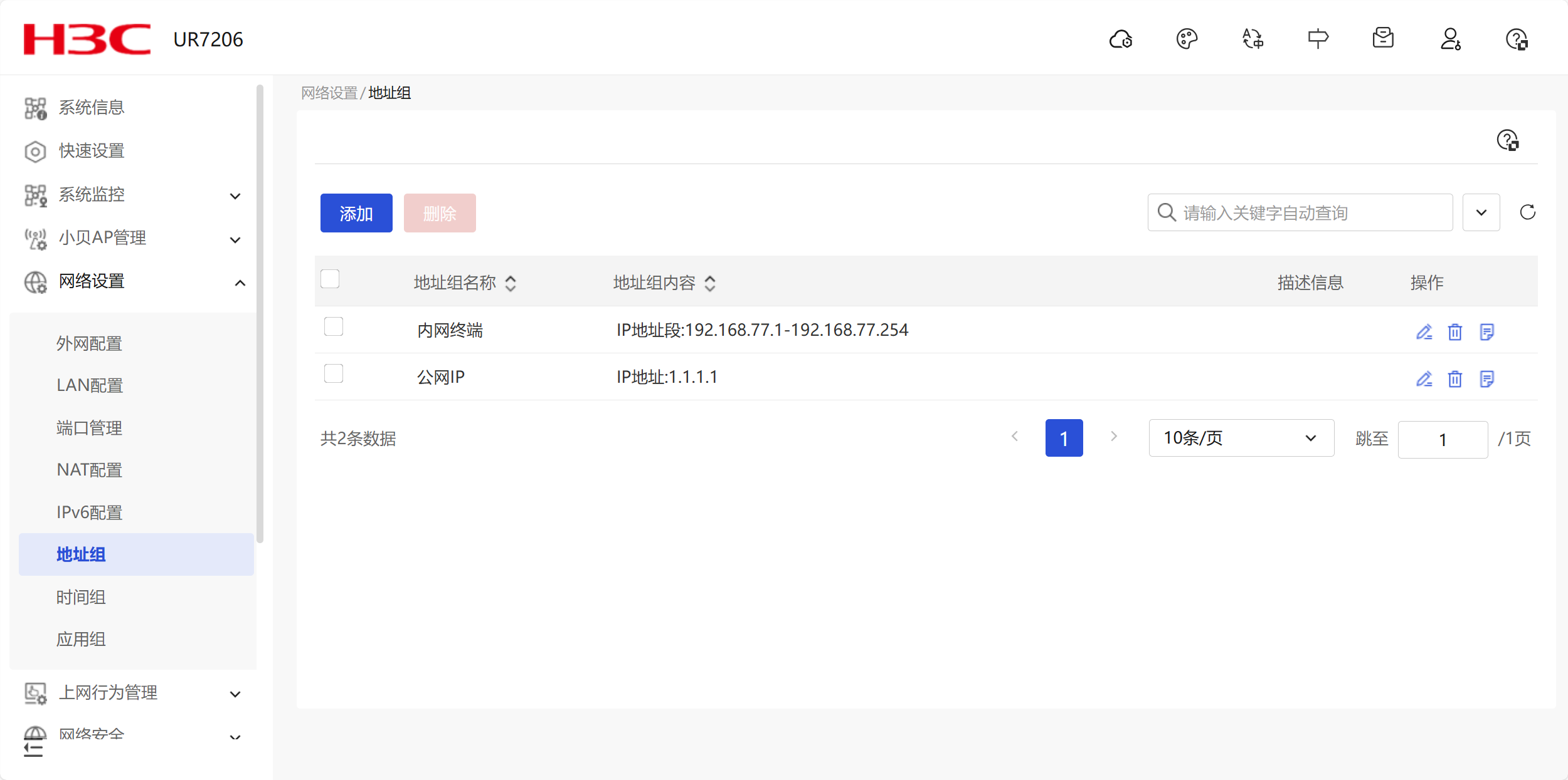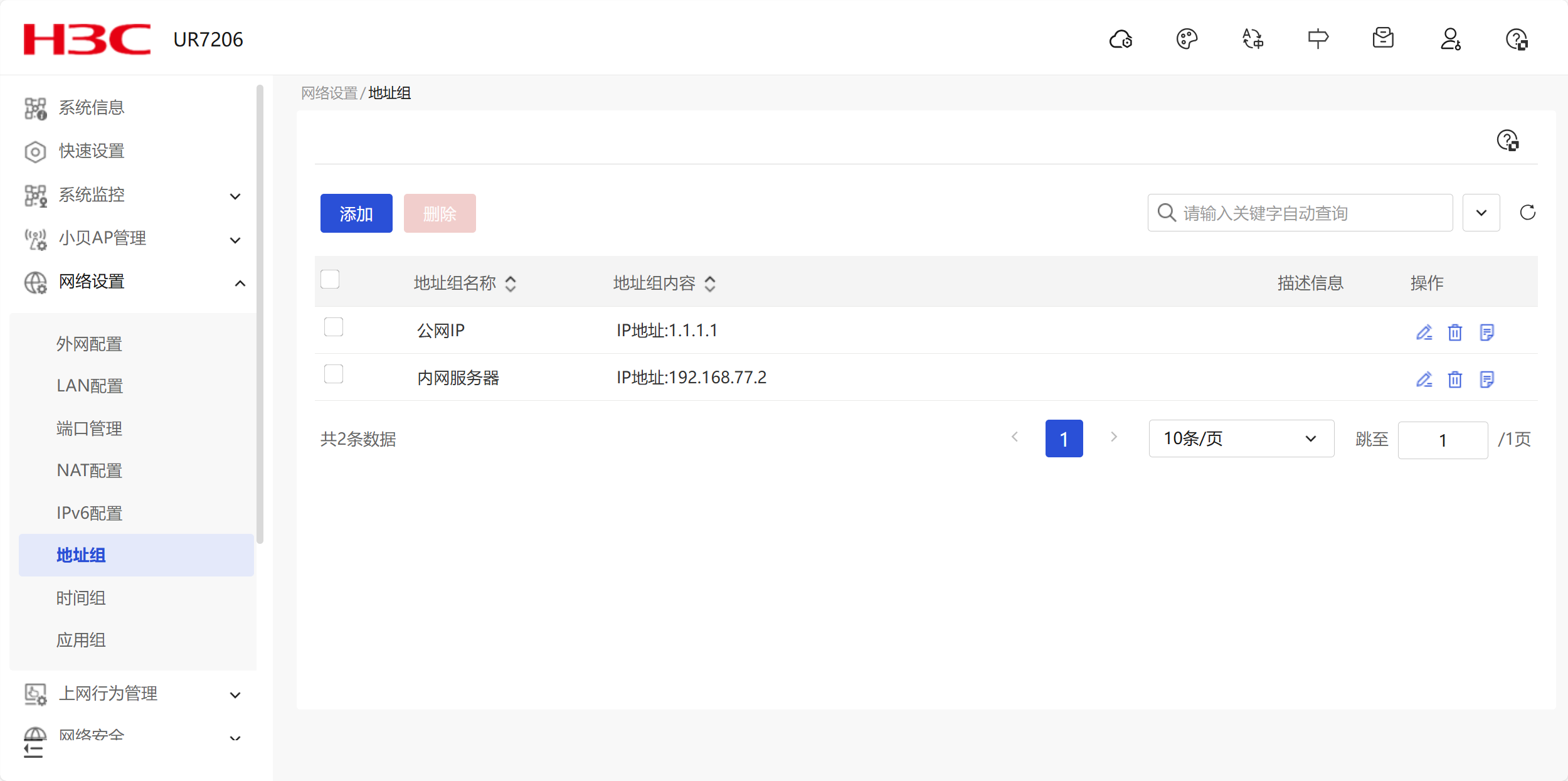 1、在"网络配置"->"地址组"中分别添加需要限制的内网终端和公网IP地址组。
