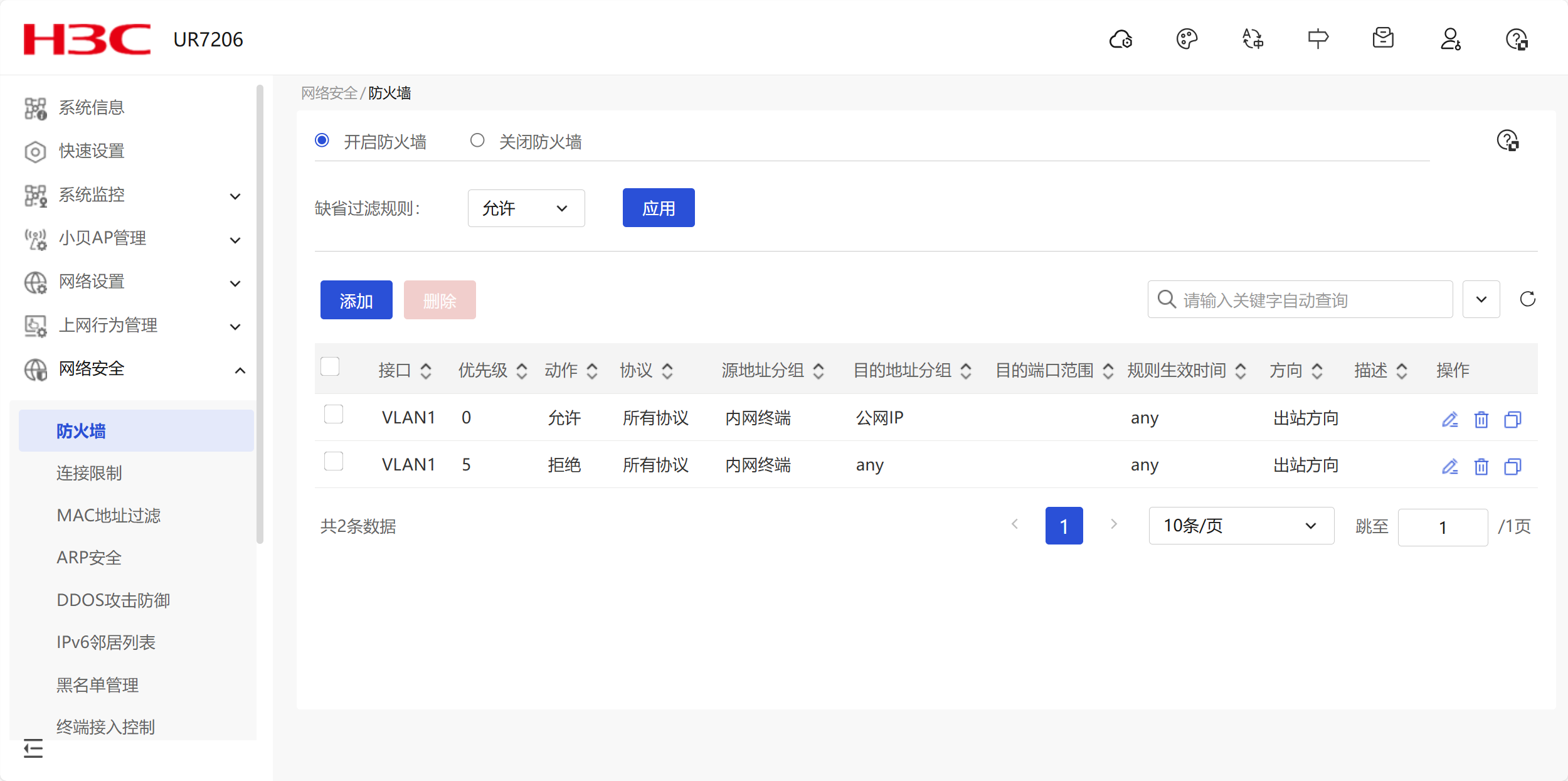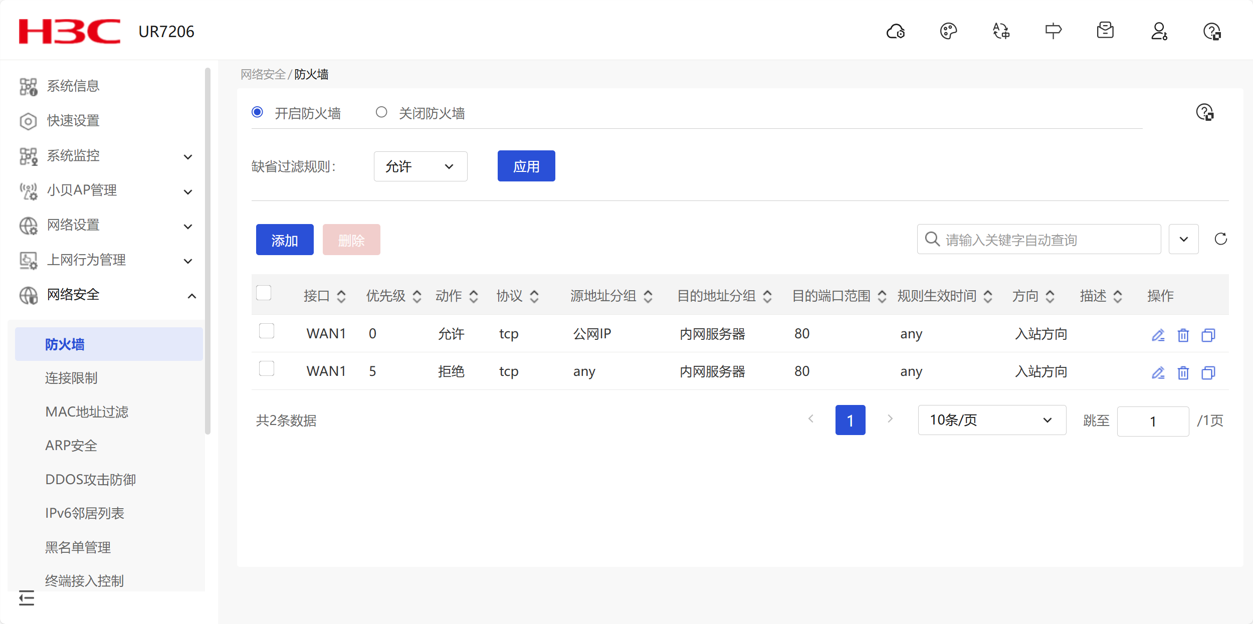 2、在"网络安全"->“防火墙”配置页面中开启防火墙,添加两条过滤规则,第一条优先级较高的允许访问目的地址是公网IP地址分组,第二条优先级较低的拒绝访问所有目的地址分组,其它参数一致。