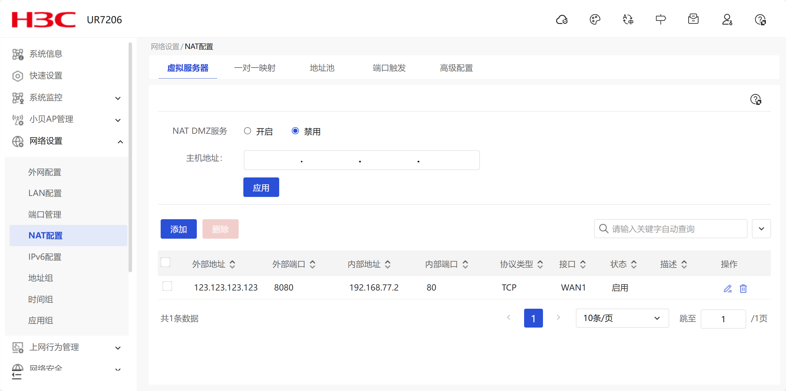 1、在"网络配置"->"NAT配置"中添加虚拟服务器映射规则。