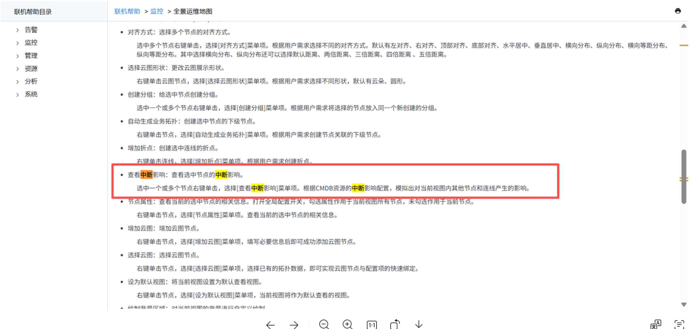 查看中断影响:可以模拟出选中节点中断后,对当前视图内其他节点和连线产生的影响。