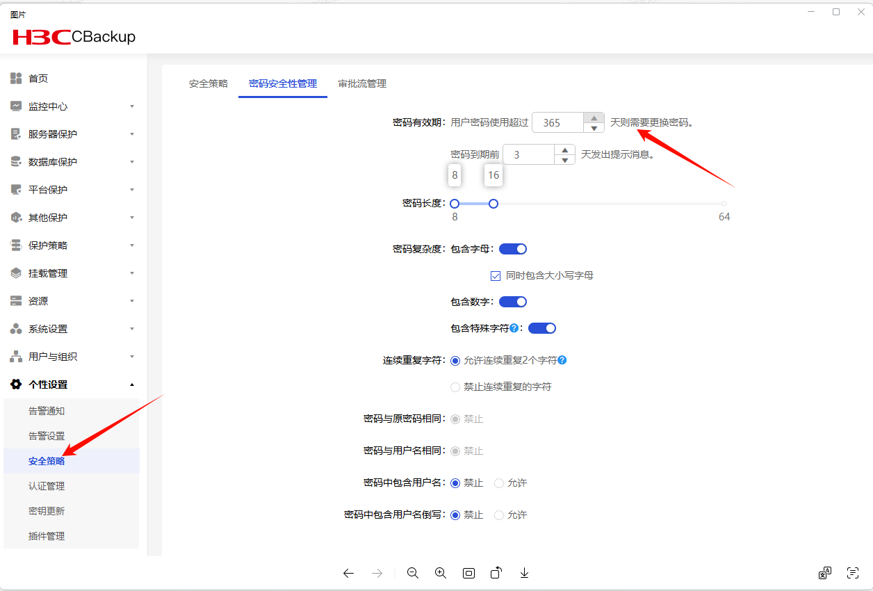 使用admin账户登录管理页面, 依次选择 个性设置 - 安全策略 - 密码安全性管理, 设置密码有效期,最长设置365天