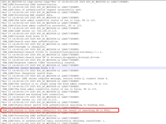 现场AC型号是WX2560X-LI,版本是R5819P14,使用AC本地portal+LDAP认证,出现认证失败问题,ldap用户查询失败。