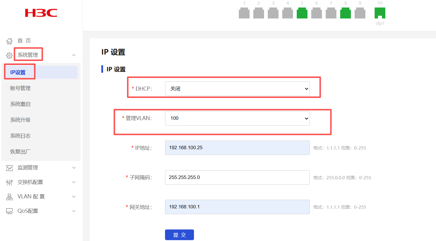 >>将所有交换机"首页"——“设备信息”中的uweb关闭,并点击“系统管理”——“IP管理”将管理vlan改回vlan100。
