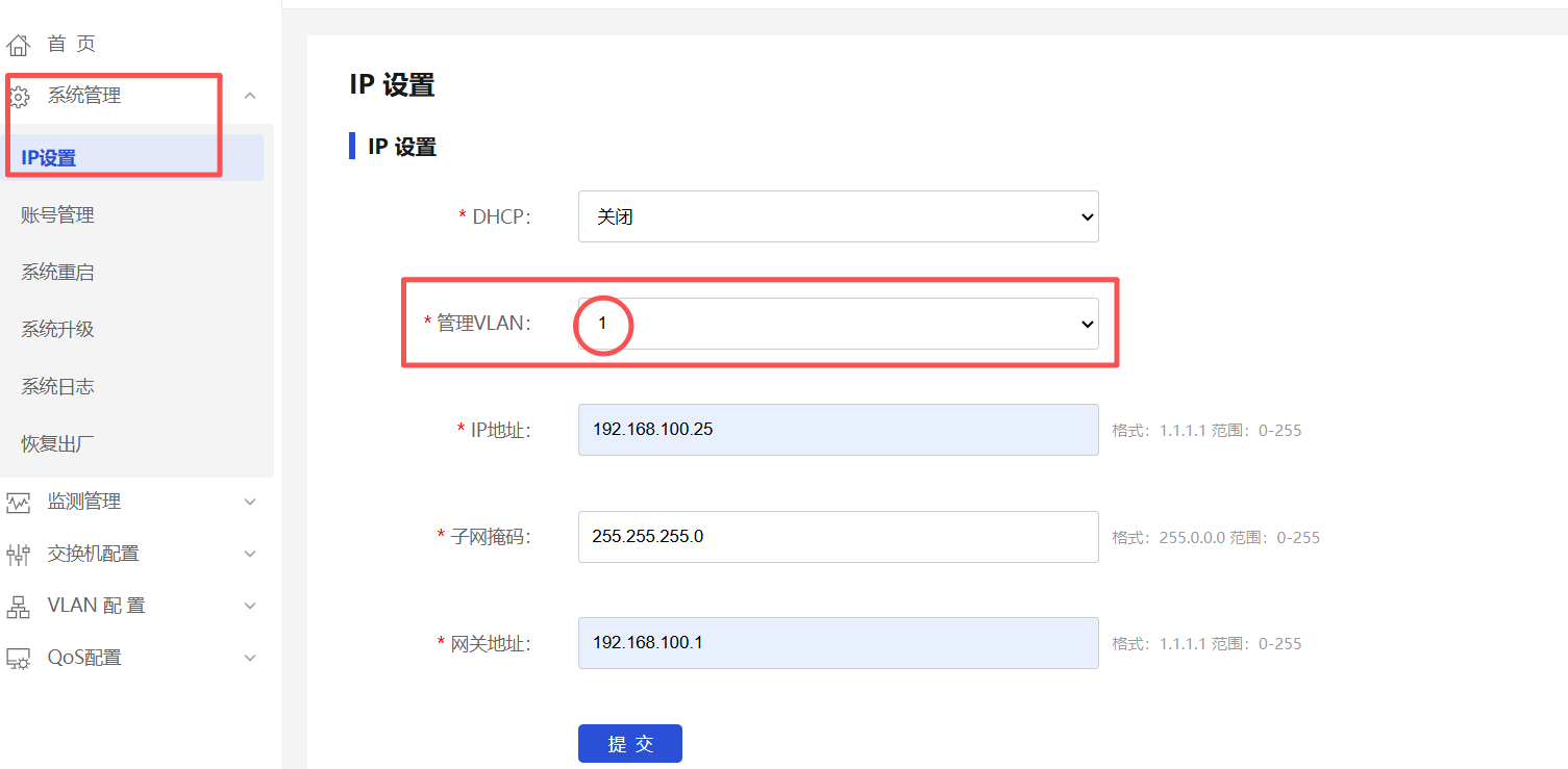 4、点击交换机web界面中的“系统管理”——“IP管理”中发现,交换机的管理vlan从vlan100变为了默认的vlan1,而网关设备上没配置放通vlan1,所以在网关上无法ping通交换机的IP地址。