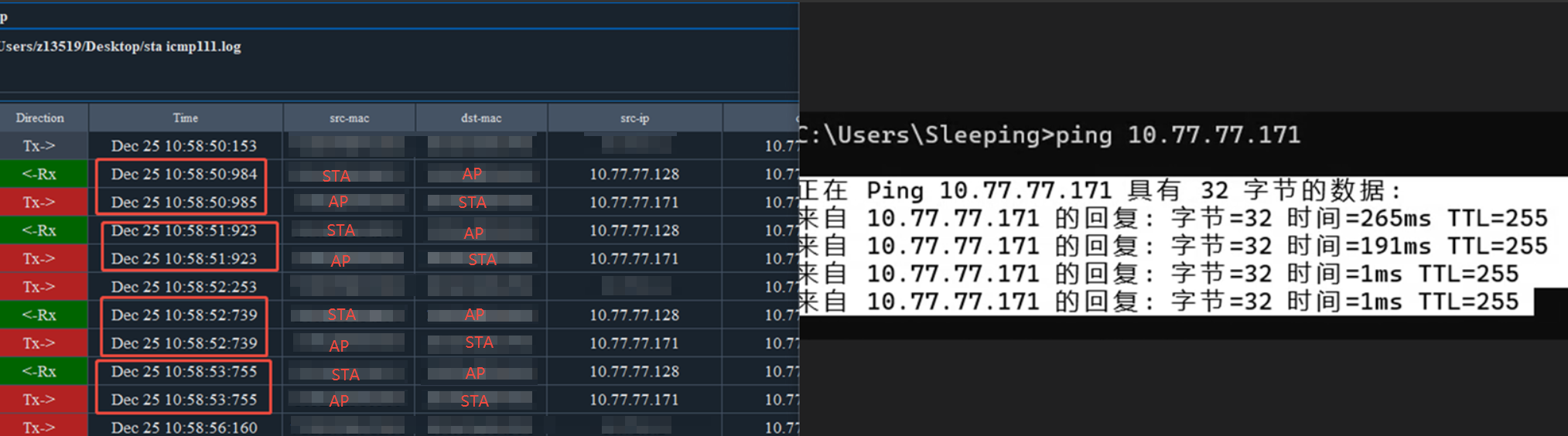 结合终端ICMP日志对照分析延迟产生的环节。结果如下: