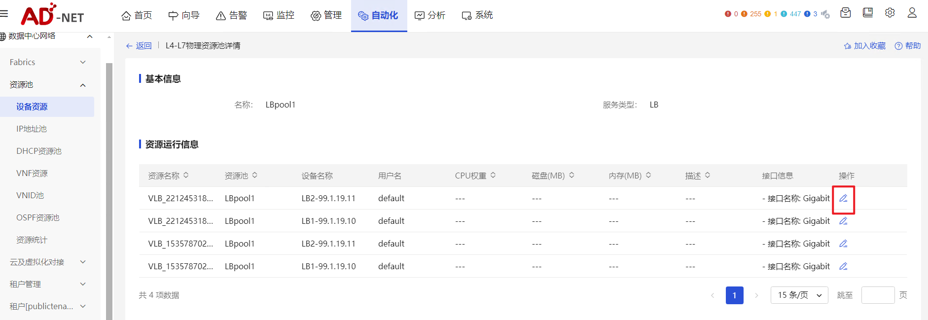 已有的vFW可以再设备资源-L4-L7物理资源池-L4-L7物理资源池详情页面,找到对应的vFW进行修改