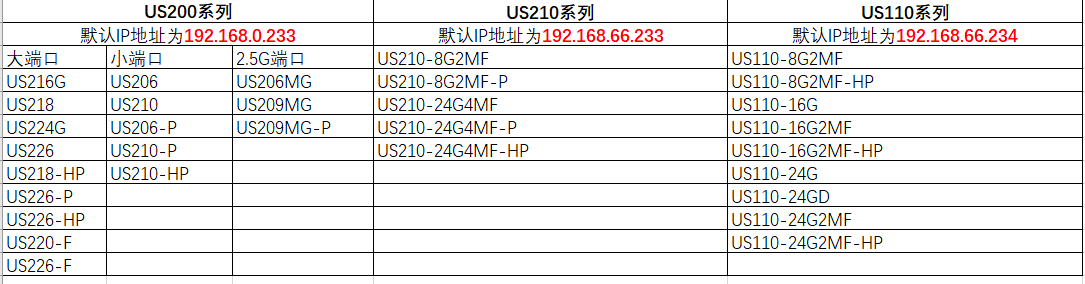 下图为小贝优选系列US200/US210和US110系列交换机默认ip地址合集