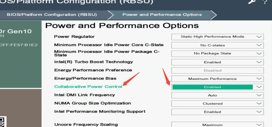 由于正常与异常设备唯一的差别就是异常设备调整过Workload Profile,从General Power Efficient Compute改为High Performance Compute,所以对比两种配置的差别,确认与CPU频率有关的选项指向Collaborative Power Control
