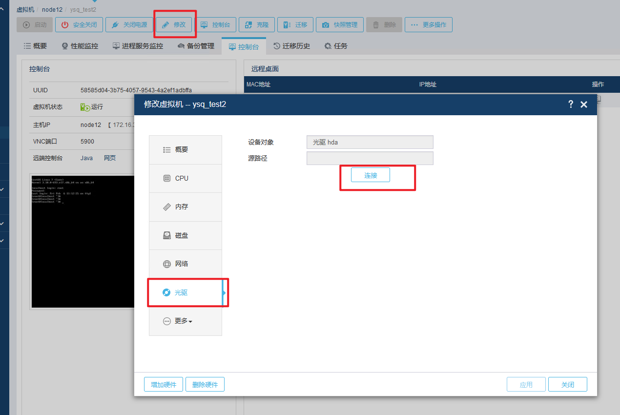 把做好的镜像复制到宿主机本地目录,然后前台选择虚拟机-修改-光驱-连接