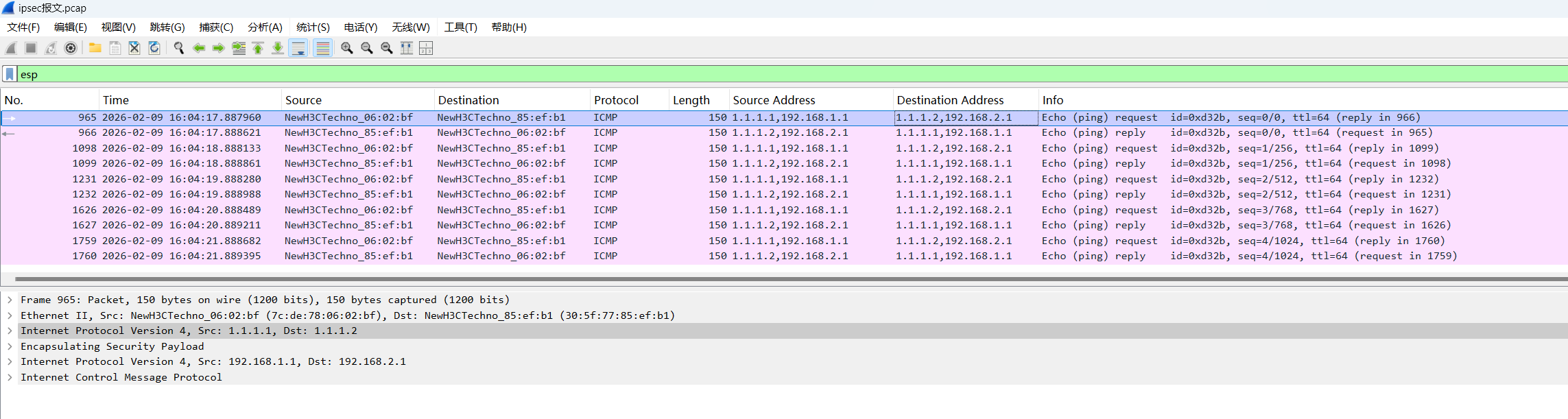 IPsec封装安全负载(IPsec ESP)报文,因为是加密封装报文,Wireshark打开后无法查看内部封装内容;有时候我们需要查看封装的报文内容,以排查定位一些问题。