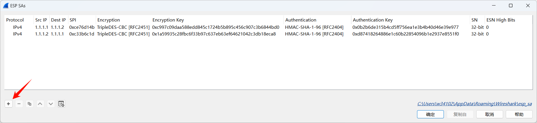 根据抓包中的SPI,在路由器上找到对应SPI的加密信息,加密信息的获取可以通过诊断中的net配置文件找ip xfrm state或直接登录设备后台输入ip xfrm state命令,建议抓包后马上收集ip xfrm state信息,时间较长可能存在密钥变化需要重新抓包。