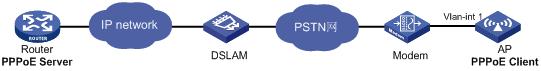 Router的Ethernet 0/1接口连接IP网络,AP的Ethernet 1/0/1通过Modem连接到PSTN网络,DSLAM连接PSTN网络与IP网络。要求Router用PAP、CHAP两种方式验证AP。使AP作为PPPoE客户端连接上PPPoE Server。假设整个网络所使用的IP地址都处于同一网段。