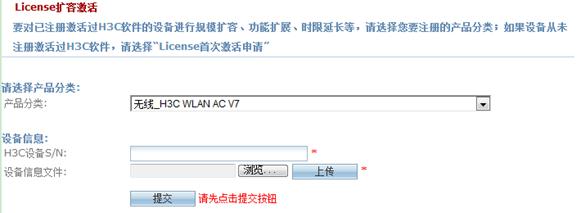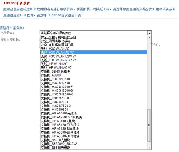 · 当使用激活文件授权方式时,如图4-10所示“产品分类”中选择“无线-H3C WLAN AC V7”。