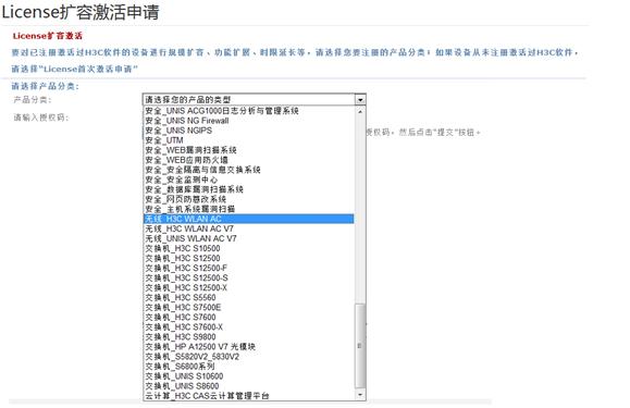 · 当使用激活码授权方式时,如图4-11所示“产品分类”中选择“无线-H3C WLAN AC”。