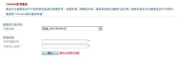 步骤1 访问H3C公司中文网站www.h3c.com/cn,依次点击“服务支持-> 授权业务-> License扩容激活申请”,即可进入如图4-9。所示的“License扩容激活”页面。