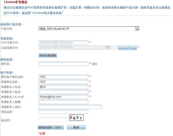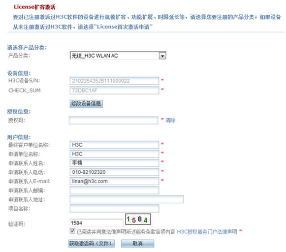 (6) 登录H3C网站(http://www.h3c.com/cn/Service/Authorize_License/Achieve_License),根据设备B的SN、DID文件和设备A的卸载码生成新的激活文件,具体的操作步骤请参见4.1 License激活申请。