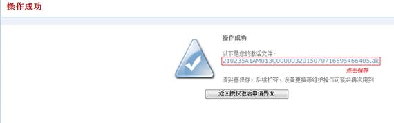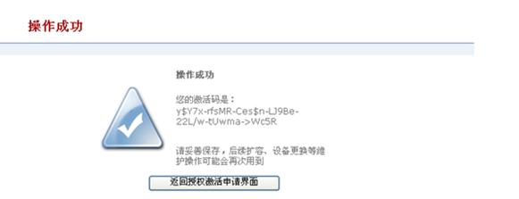 · 激活码授权方式:系统将提示如图4-17所示的对话框,单击<确定>按钮,进入图4-18操作成功页面,页面中有已经申请下来的激活码。