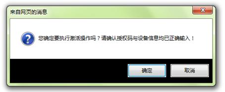 · 激活码授权方式:系统将提示如图4-7所示的对话框,单击<确定>按钮,进入图4-8操作成功页面,页面中有已经申请下来的激活码。