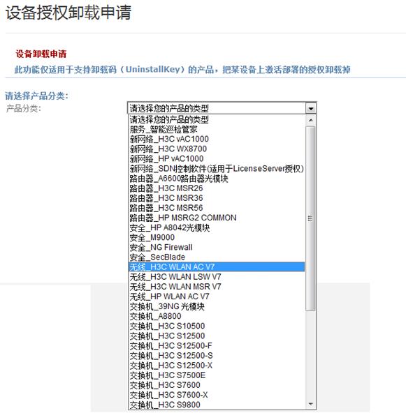 (3) 在“产品分类”中选择“无线-H3C WLAN AC V7”。