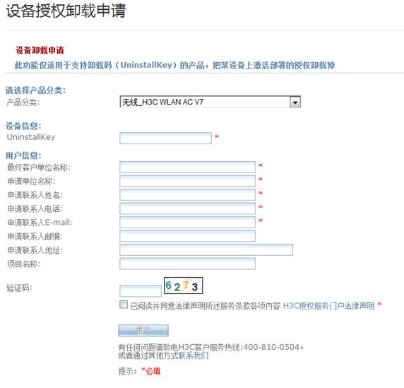 (2) 访问H3C公司中文网站www.h3c.com/cn,依次点击“服务支持-> 授权业务-> 设备授权卸载申请”,即可进入如图4-19所示的“设备授权卸载申请”页面。