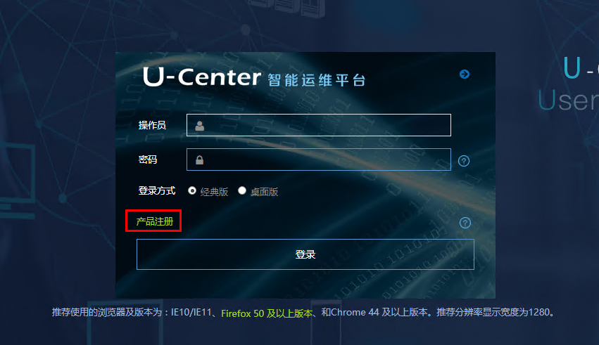 1、在iMC智能管理中心登录界面上点击“产品注册”链接,进入注册操作选择窗口: