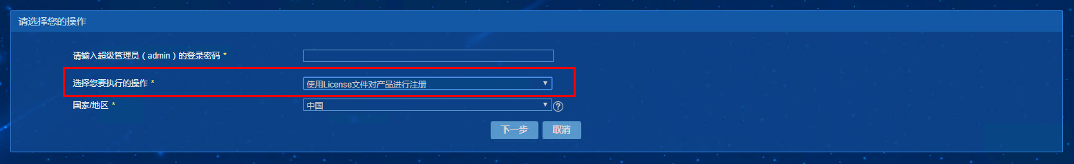 3、当获取license后,可以通过iMC登录界面中的“产品注册”功能进行注册。首先,在智能管理中心登录界面中点击“产品注册”链接,进入注册操作选择窗口。输入admin用户的登录密码,并将“选择您要执行的操作”设置为“使用License文件对产品进行注册”。后单击【下一步】按钮,进入license文件选择窗口: