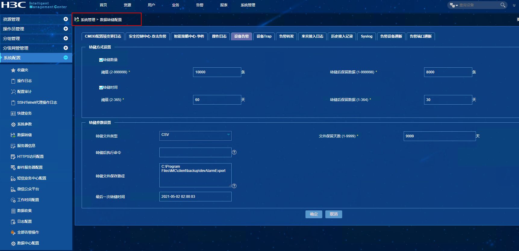 可以配置下数据转储,把历史不关注的告警从数据库中转出保存,优化查询速度,转储操作示意如下:
