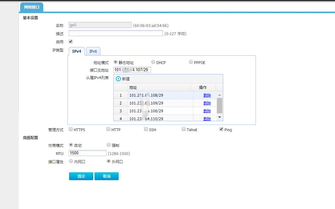这个线路是静态IP 有5个,尾数 106到110个,接口主地址是 尾数是107, 我想把其中的一个IP 106 ,分配到ACG 1000 另外一个GE4端口接入6520 实现上网需要怎么配置