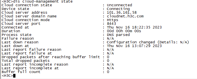 cloud-management server domain cloudnet.h3c.com// 此命令有些设备默认已配置,有些没有,必须添加配置;