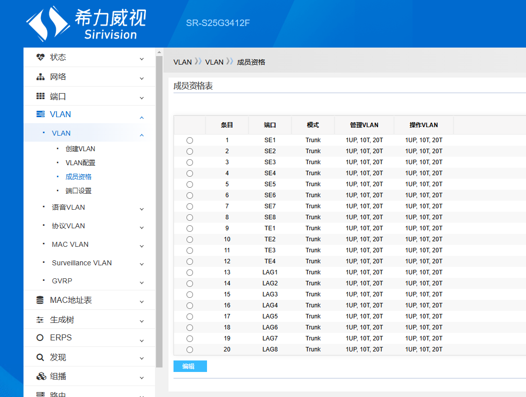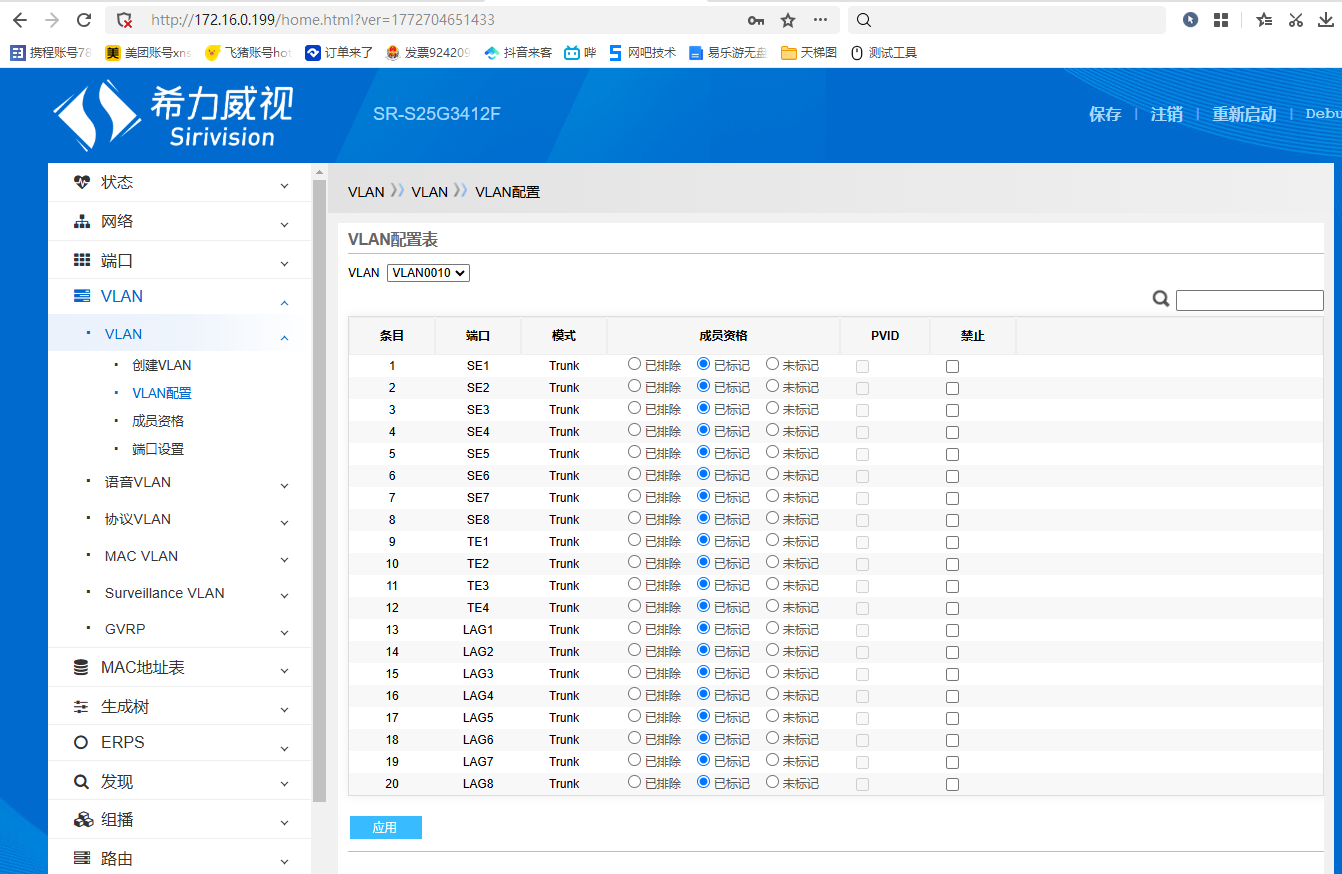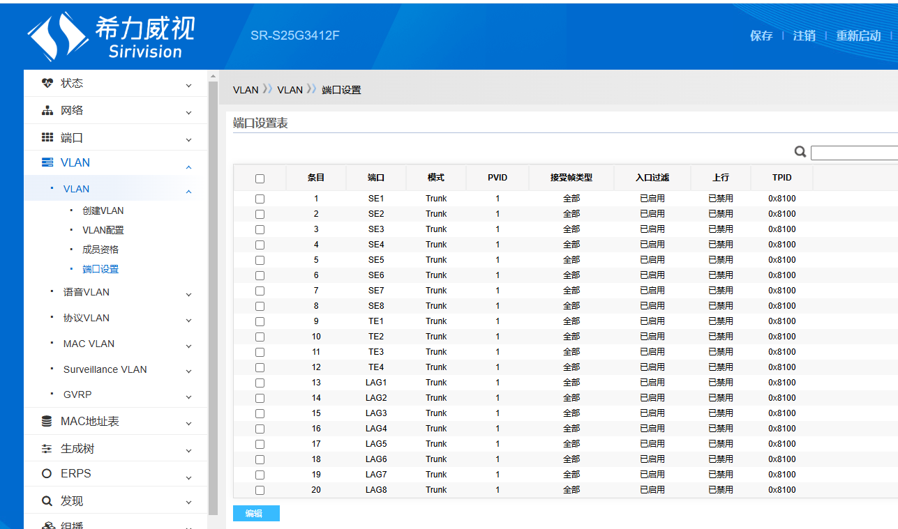 接口管理->Trunk 口设置->允许通过的VLAN:All(所有VLAN)