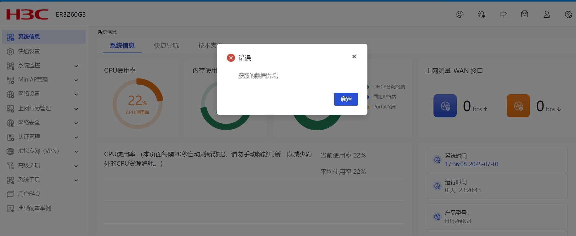 ER3260G3+登录管理页,报错“获取的数据错误”
