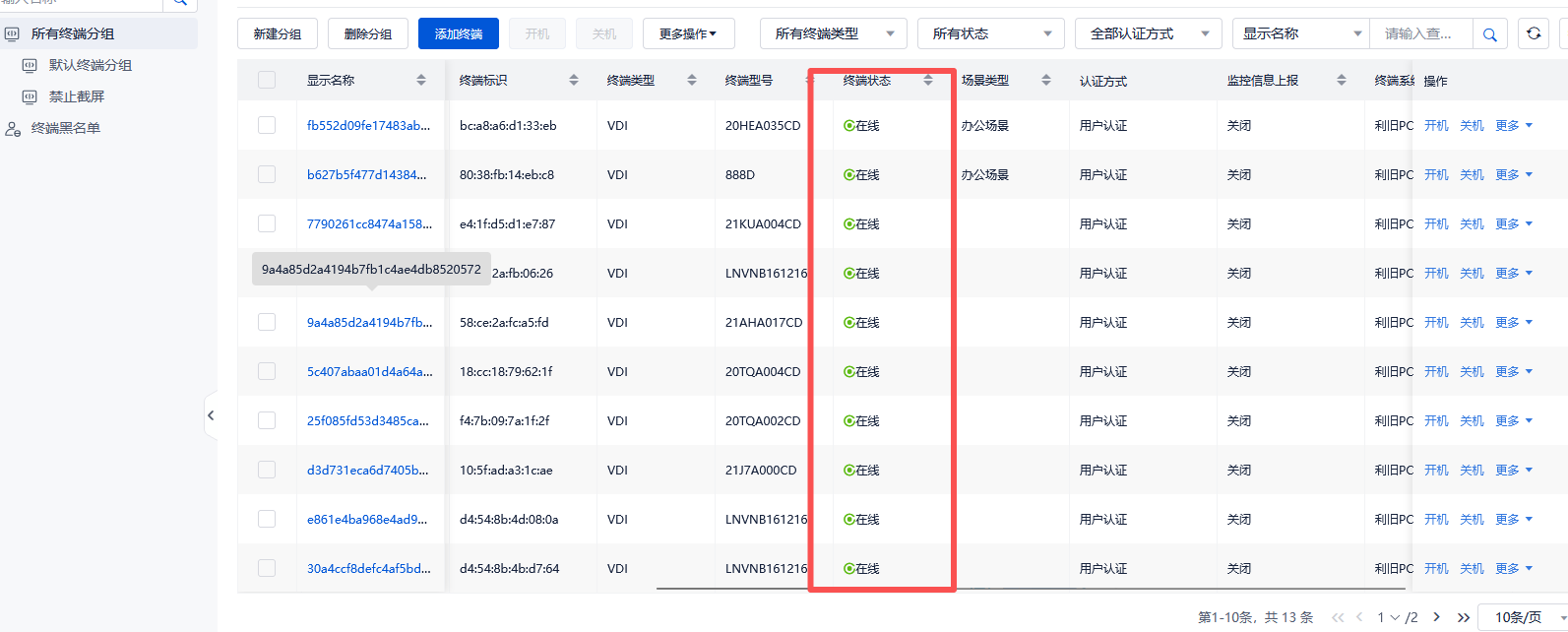 终端"在线"状态,表明终端与管理平台心跳通信正常。