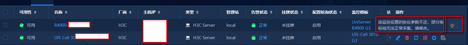 监控R4900G3服务器提示“该监控设置协议参数不足,部分指标无法正常采集,请修改。”