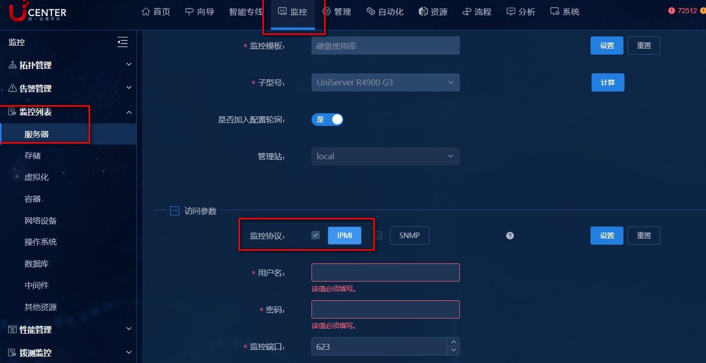 添加服务器监视时,同时配置IPMI和SNMP参数即可,部分指标采集需要通过SNMP协议才能读取到。
