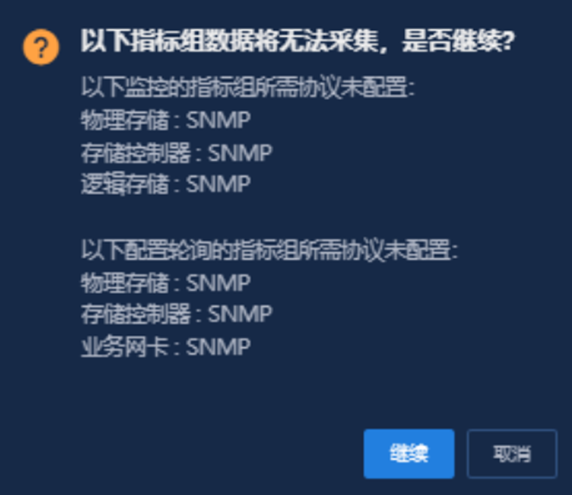 配置完IPMI参数后点击测试,出现如下提示,添加完成后,出现“该监控设置协议参数不足,部分指标无法正常采集,请修改。”的提示。