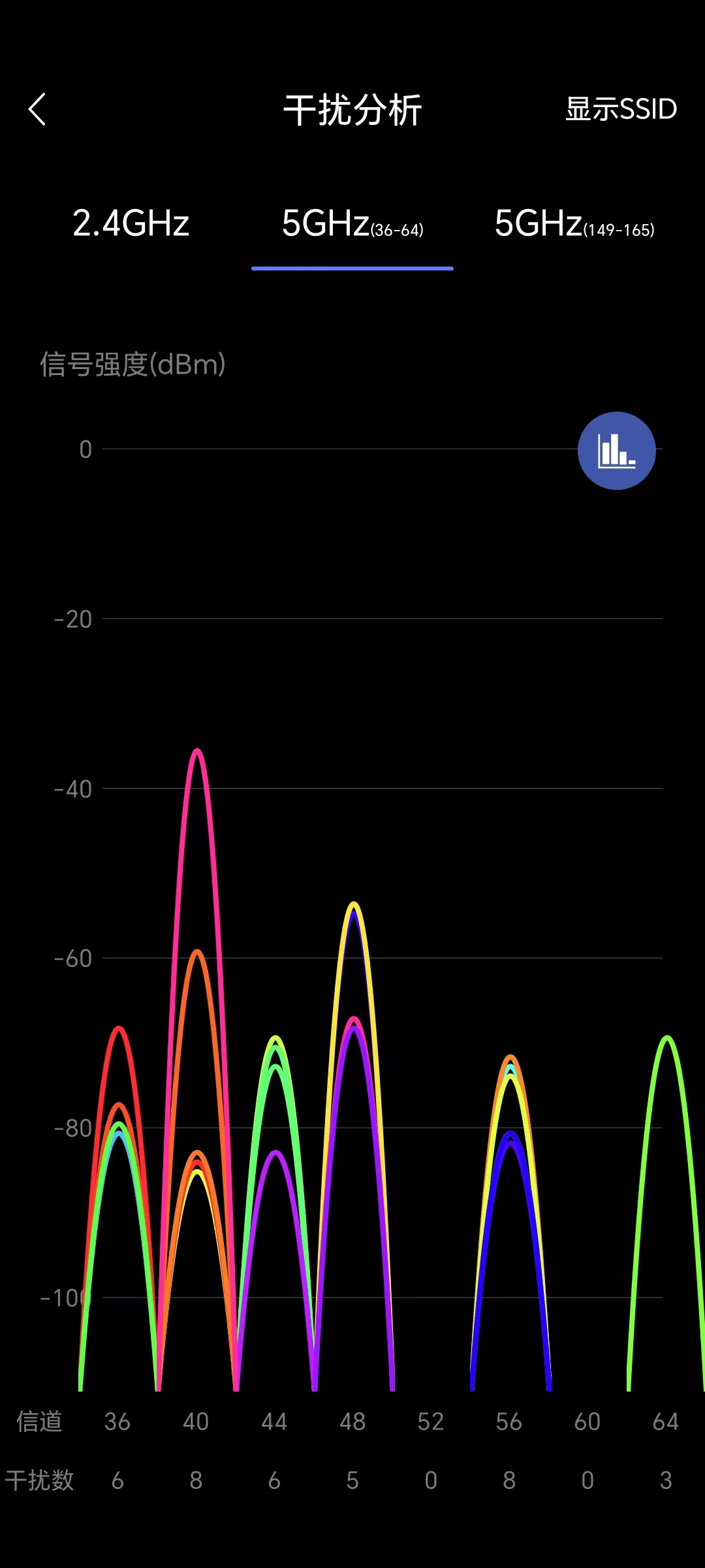 这是从Cloudnet App上、信道干扰中截的图,里边没有相关说明,各种颜色代表什么,想知道截图中的颜色分别代表社么意思,有知道的帮解释下,谢谢!