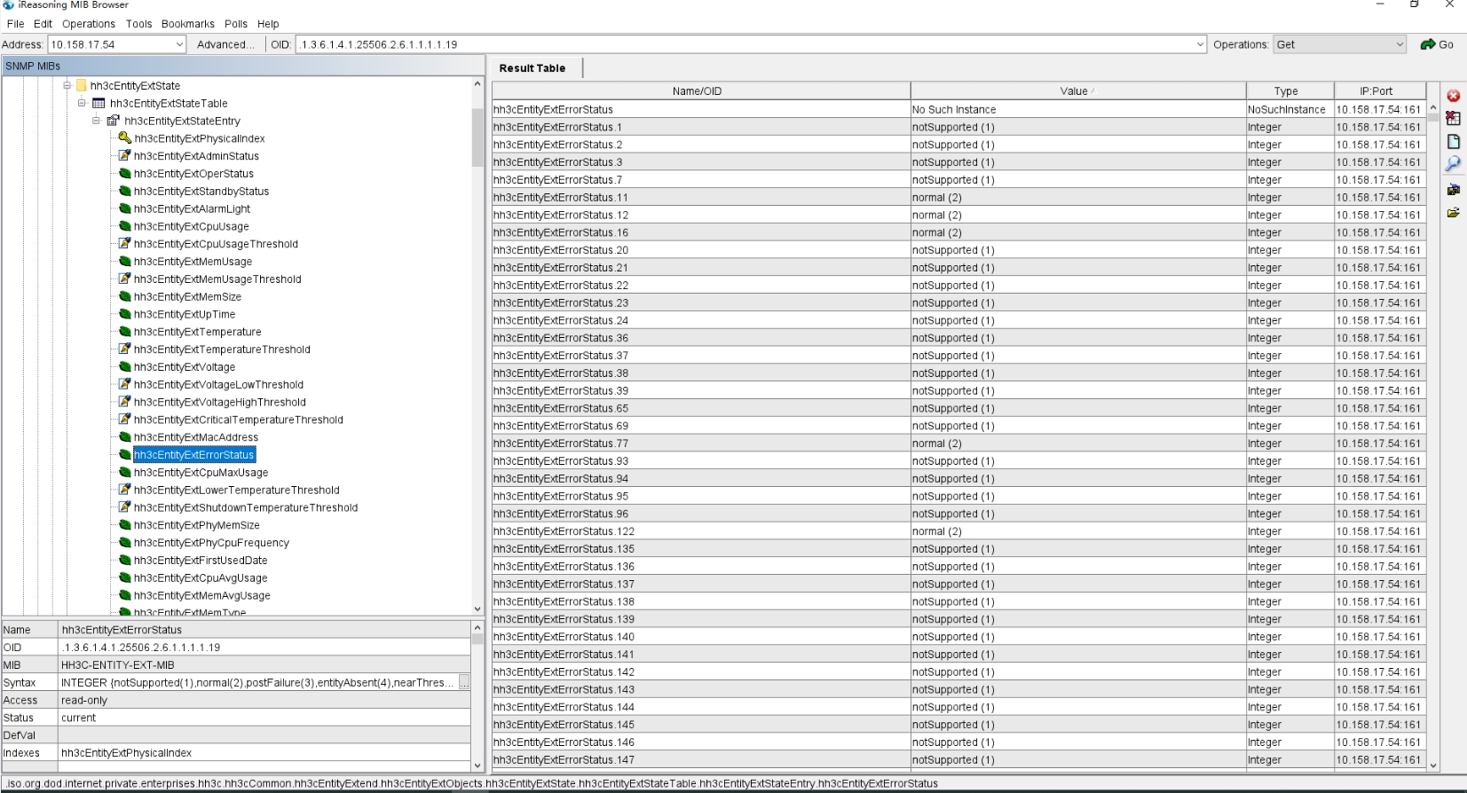 ,然后执行 Walk 操作(而不仅仅是 Get)。Walk 操作会遍历该节点下的所有实例。hh3cEntityExtErrorStatus