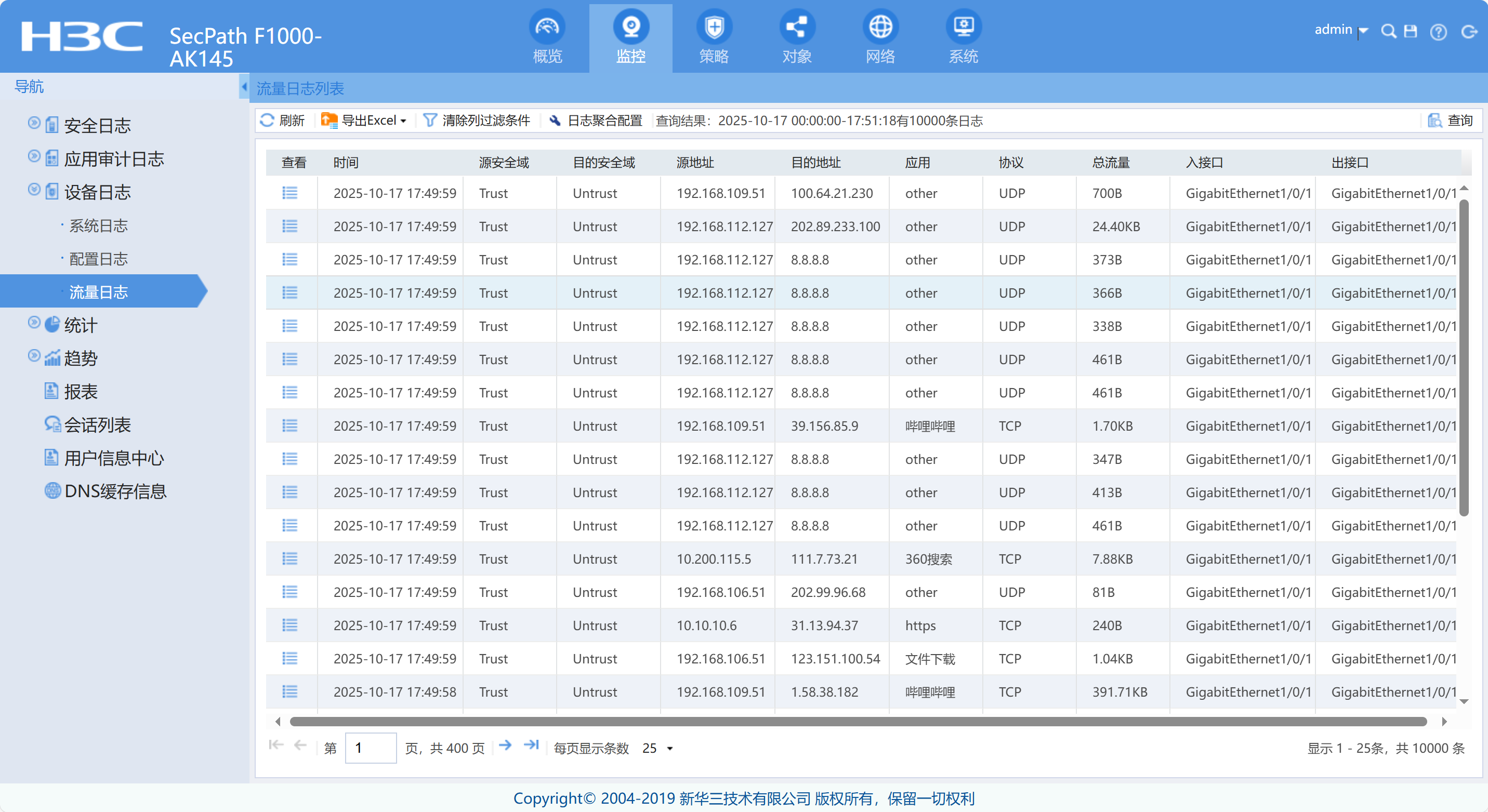 系统日志只能看512,流量日志只能看10000,有硬盘,怎么查看和导出更多日志,硬盘还有很多空间目前只用了2-3%,为什么手动选择日志时间范围很往前的就没有了。