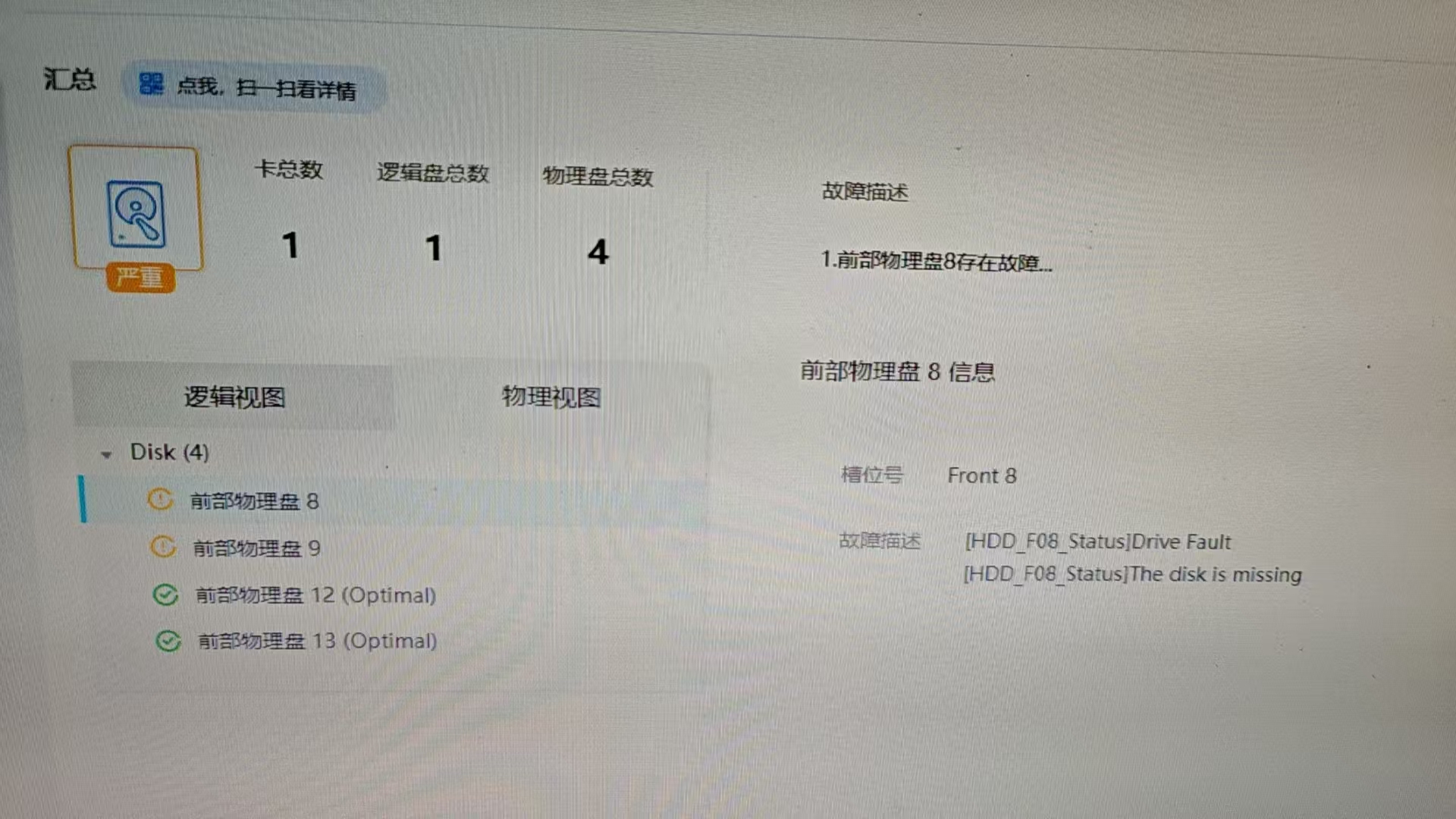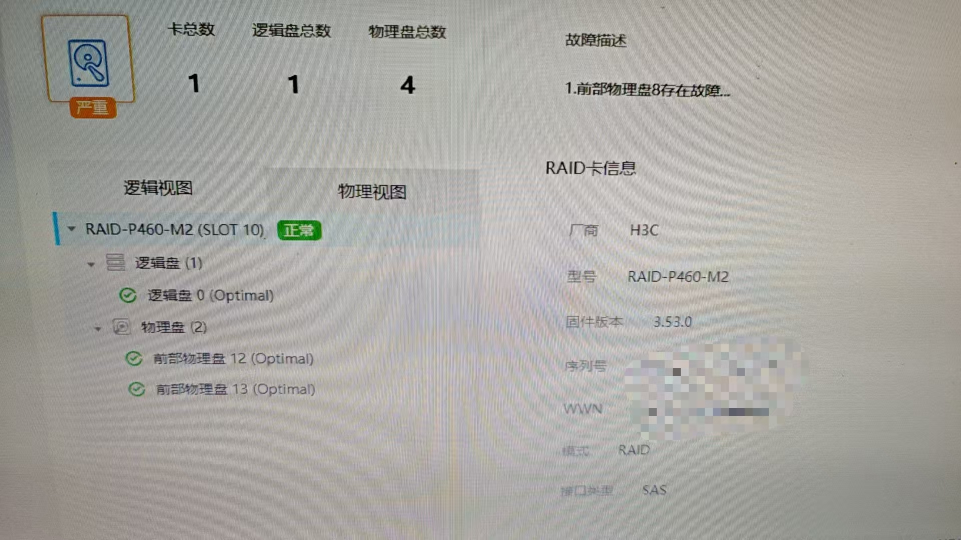 有台R4900G3服务器,HDM上有硬盘严重告警,有两个硬盘位上硬盘丢失,服务器本身只有两个1.2T硬盘做RAID1,但是HDM上又显示物理盘有4个,然后有两个丢失。这个是什么原因,原来的固件是2.97.0.3,上次我升级为官网上最新的3.55.04,这个告警就消失了,才一个星期不到这个告警又出现了。