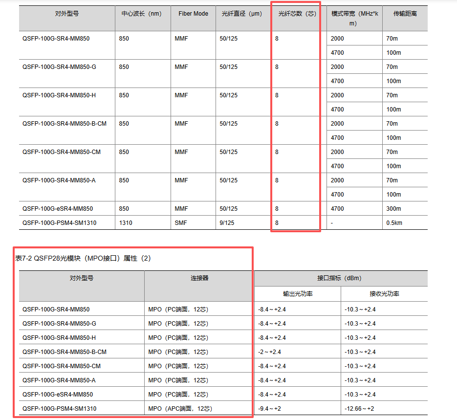 QSFP28 100G SR4/eSR4 光模块采用MPO接口,支持使用8芯或12芯光纤跳线,两者均可兼容。模块内部仅使用8根光纤(4发4收),不使用中间4芯。
