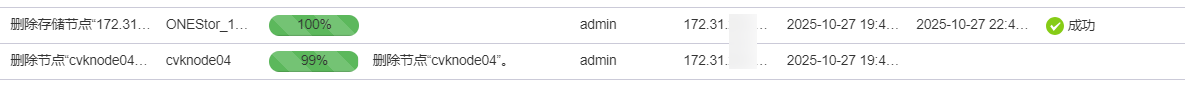2、删除管理平台删除主机进度卡在99%,是因为本局点需要被踢出集群的node硬盘空间较大(21T),当PGS的百分比状态降到0%后(具体等待时间因节点硬盘空间而定),该主机节点会自动被平台集群剔除,完成删除主机节点操作。