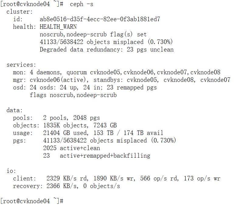 5、判断剔除主机过程是否为卡起状态,可以通过ceph -w | grep bakcfill查看是否存在删除任务,是否仍然在做数据平衡(回填)操作(实时回显数据平衡任务)。