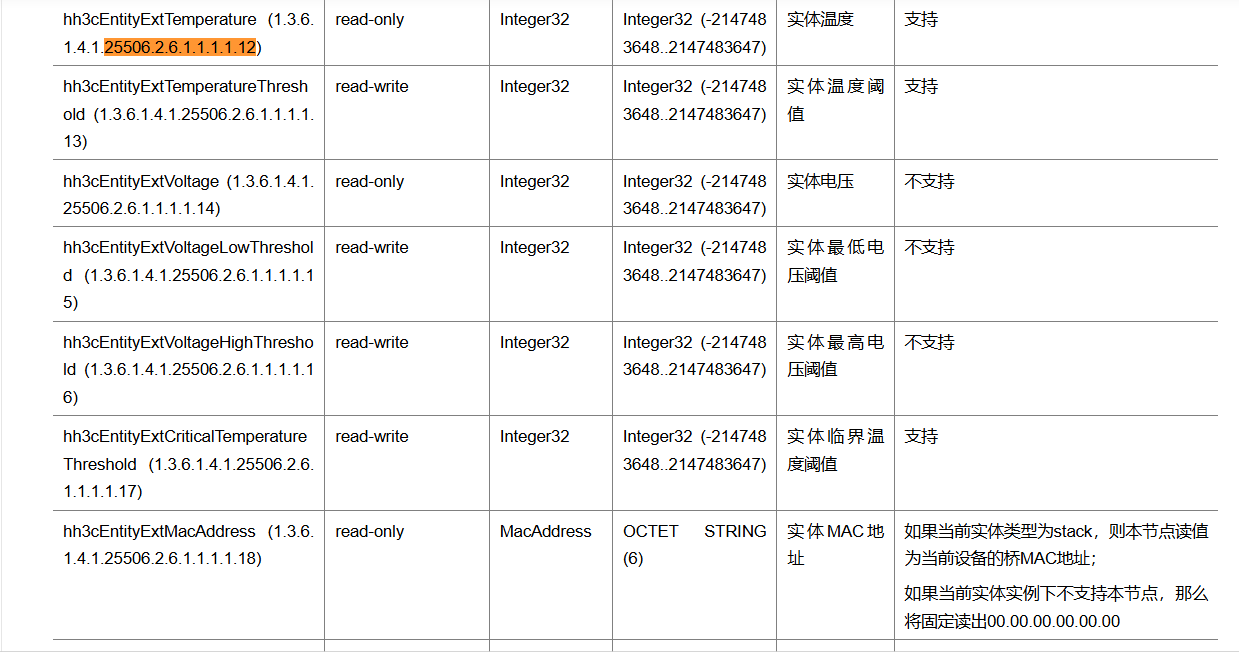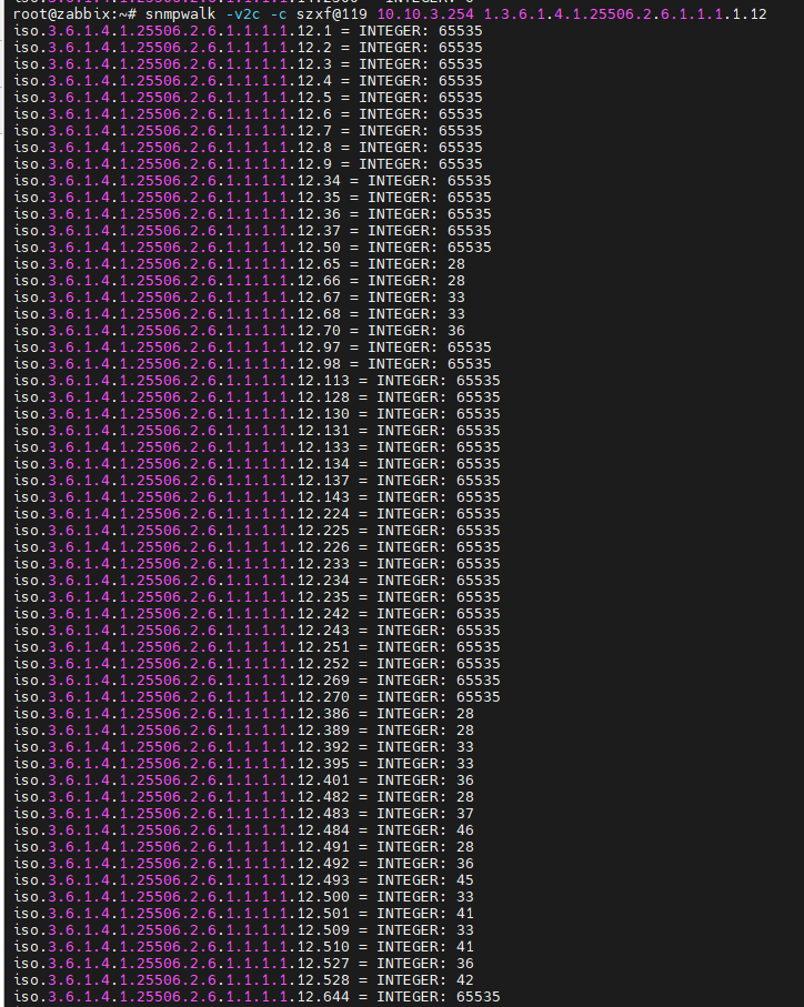 65535的含义65535在网络设备的 OID 中通常表示 **“无效”“未启用” 或 “不支持”**。结合您的查询结果,大量65535说明这些 OID 对应的功能在当前设备上未配置或不支持,属于正常现象。28、33、36等的含义snmpwalk -v2c -c 团体字 设备IP 1.3.6.1.2.1.1(系统信息 OID),确认设备型号和系统版本,再结合版本特性推测用途。65535是 “未生效 / 不支持” 的标识,而其他数值是设备的实际监控项,可通过实际操作和版本匹配进一步明确具体含义。