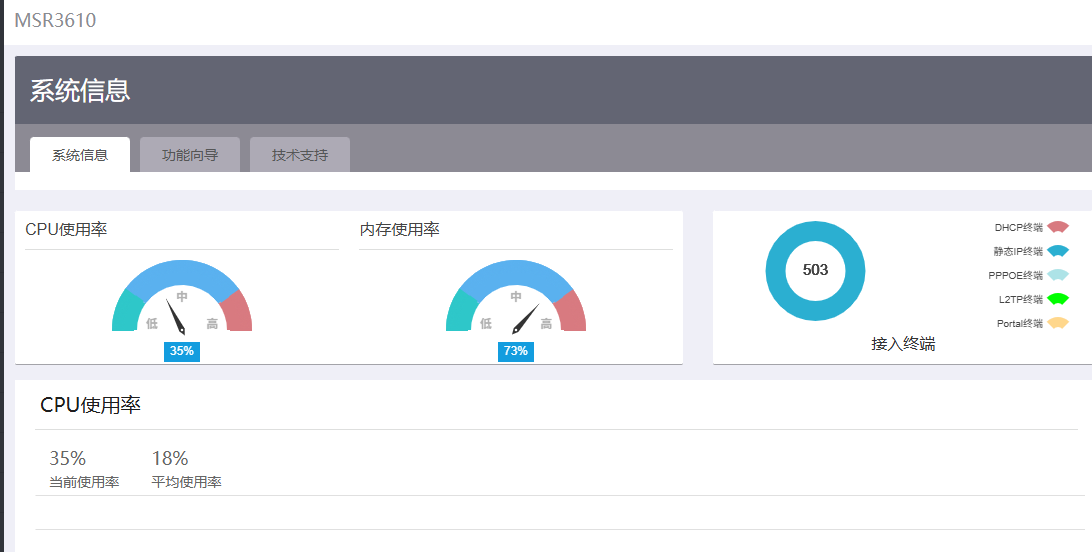 - 设备硬件配置 - MSR3610 有不同子型号(如 MSR3610-X1、MSR3610-IE 等),需确认是否具备多业务处理能力:- 若配备多核 CPU(如双核 1.2GHz 及以上)、≥1GB 内存,且开启了 DHCP 中继、简单 ACL 等基础功能,500 台终端的会话数(预估单终端 10-20 个会话,总计 5000-10000 个)在设备承载范围内;