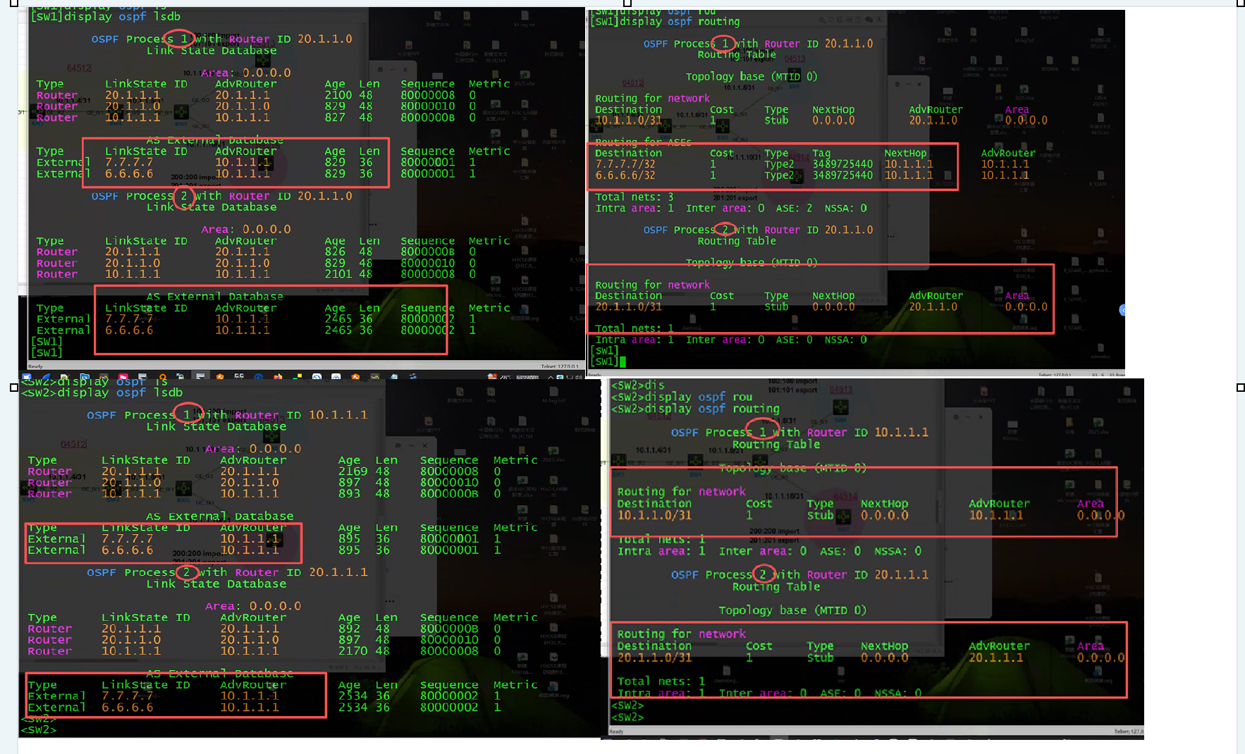 display ospf 1 routing-table和display bgp routing-table,确认是否存在相同路由的循环引入,若有则调整引入方向或增加路由策略过滤。ospf 1 vpn-instance im的路由发布功能,确保 VPN 实例的路由能被公网 OSPF 进程识别(如配置import-route ospf vpn-instance im并结合路由策略)。display ip routing-table protocol ospf和display ip routing-table protocol bgp,对比不同协议路由的优先级。display ospf 1 lsdb external,确认外部路由的传播状态。import-route命令的参数,确保引入方向、优先级、路由策略配置正确。