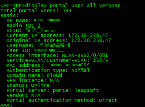 1. 输入:dis portal user all verbose,然后通过repeat 1 delay N的命令(N是输入“dis portal user all verbose”命令的周期,单位:秒),将输出打印到如CRT的回显记录上,但是这个很消耗AC性能,不建议一直保持;